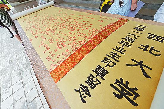 时值2016年毕业季,西北大学的校园里,一副象征着学校114年办学历史的长11.4米的印章长卷,吸引着过往师生的目光。即将离校的2016届毕业生们,手持学校送给他们每一个人的一方“蓝田玉印章”,依次将自己的名字盖在长卷之上,仪式简单而庄重。