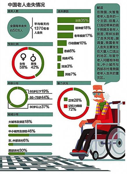留守老人多有走失 调查显示,根据公安部门的监测信息,中国每年有效报警信息约为1亿起,失踪(招领)人员警情占警情总量的1%,其中约有50%的失踪(招领)人员警情为老人。