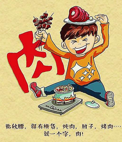 如果从字面意思来理解“秋膘”,可以直译为秋天的肥肉。按照传统的说法,夏季炎热,吃不下、睡不好,体重难免要掉;等过了立秋,赶紧炖肉进补,想办法把夏天掉的肉给补回来,此为“贴秋膘”。