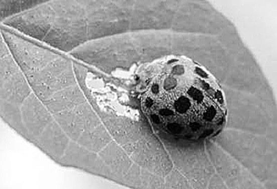 形态特征 成虫体长7-8毫米,半球形,赤褐色,体表密生黄褐色细毛。前胸背板前缘凹陷,中央有一较大的剑状斑纹,两侧各有2个黑色小斑(有时合成一个)。两鞘翅上各有14个黑斑,鞘翅基部3个黑斑和后方的4个黑斑不在一条直线上。卵长1.4毫米,纵立,鲜黄色,有纵纹。幼虫体长约9毫米,淡黄褐色,长椭圆状,背面隆起,各节具黑色枝刺。蛹长约6毫米,椭圆形,淡黄色,背面有稀疏细毛及黑色斑纹。尾端包着未龄的蜕皮。