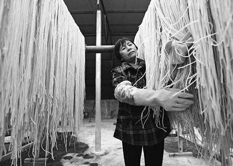 1月8日,石泉县民丰农产品专业合作社内,中池镇军民村村民冯尚秀在整理刚刚挂好的红薯粉条。该村依托当地优质红薯资源,成立合作社,采取“支部+X+贫困户”的模式,推广红薯种植,效增加村民收入。