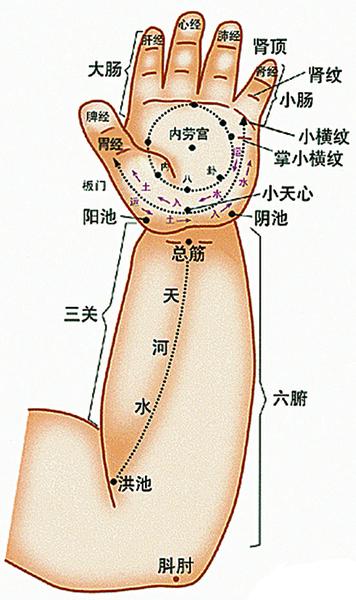 利小便穴 自腕部沿手掌尺侧缘推向小指尖称为利小便穴。