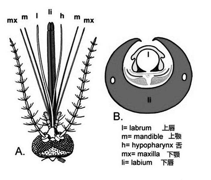 上颚和下颚是蚊子刺入皮肤的主要工具。上颚细长尖锐如同西洋剑,下颚的末端长有“刀片”和倒钩,它既可以切割组织,也可以防止口器在深入“钻探”的过程中打滑。除了锋利之外,这些“长剑”还有惊人的柔韧度。一旦找到了血管,占据了口器中心位置的一对主要输送管道——上唇和舌就会开始工作。这两根管道的流向是相反的,上唇负责吸取,而舌负责“注射”。舌将蚊子的唾液从唾液腺中导出,注入人体。这也是蚊子叮人时真正有危险的一步——如果蚊子体内携带者疟原虫、寨卡病毒之类的蚊媒病原体,那病原体也会随着唾液混入人体内。