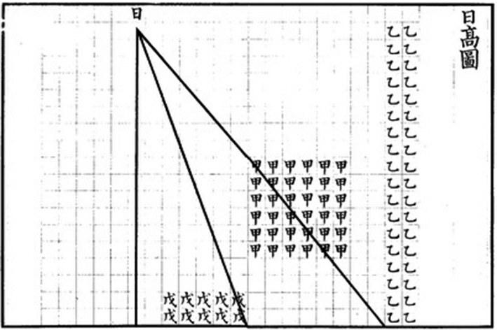 另外,把8尺长的竹竿竖在周王城中一块空地上,当作“表”(也称“髀”);可以观察到,在每年夏至日正午,表的日影最短,为1尺6寸;并且朝着正南(北)方向,每过1000里,表影就短(长)1寸。于是,在表影长为6尺的那天正午,表正南6万里处日下无影;运用勾股定理和比例方法算出,那时太阳到地面日下无影处的距离为8万里,太阳到王城观测点的距离为10万里;进一步算出,太阳的直径为1250里。