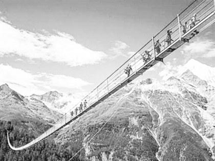 据外媒报道,在瑞士拥有目前全球最长行人吊桥“欧洲大桥”,吊桥除了让游客欣赏世上绝无仅有的山峦美景外,更让来往山谷的路程大大缩减。吊桥位于瑞士最高峰多姆峰一座山谷上,全长约493米,与山谷底部最大垂直距离约85米,连接瑞士山区小镇采尔马特及格雷兴。大桥由两条钢索吊起,而且更有特别设计防止摇动。