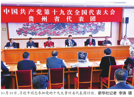 新华社北京10月19日电 习近平同志19日上午在参加党的十九大贵州省代表团讨论时强调,党的十九大报告进一步指明了党和国家事业的前进方向,是我们党团结带领全国各族人民在新时代坚持和发展中国特色社会主义的政治宣言和行动纲领。要深刻学习领会中国特色社会主义进入新时代的新论断,深刻学习领会我国社会主要矛盾发生变化的新特点,深刻学习领会分两步走全面建设社会主义现代化国家的新目标,深刻学习领会党的建设的新要求,激励全党全国各族人民万众一心,开拓进取,把新时代中国特色社会主义推向前进。
