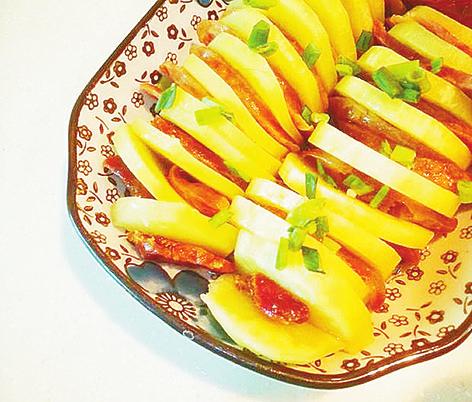 1、将土豆去皮洗净。2、然后切长厚点的片。3、腊肠也切成片。4、将腊肠片和土豆片交叠摆放在盘中。5、上蒸锅,大火上汽后转中小火蒸20分钟左右,至土豆绵软。6、料汁调好备用。7、土豆出锅,淋上调好的料汁,吃时拌匀即可。