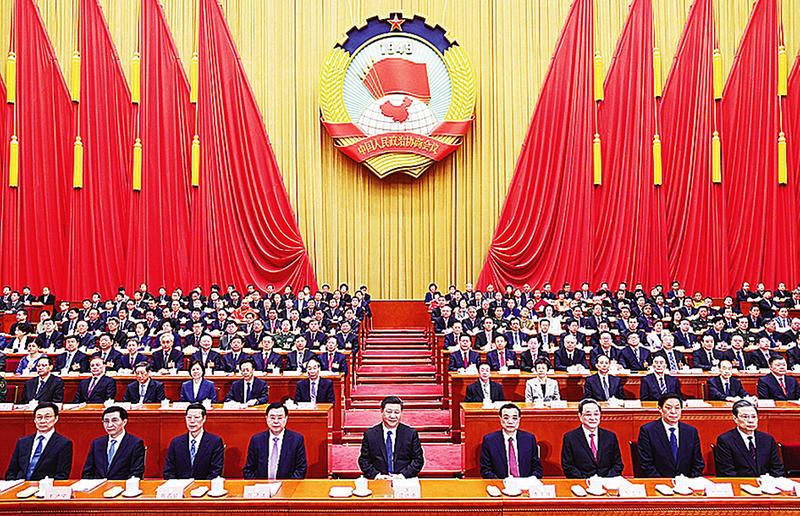 3月3日,中国人民政治协商会议第十三届全国委员会第一次会议在北京人民大会堂开幕。这是习近平、李克强、张德江、俞正声、张高丽、栗战书、王沪宁、赵乐际、韩正在主席台就座。 新华社记者 李学仁 摄