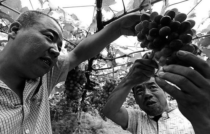 7月12日,在西安浐水源现代农业产业园,长安区魏寨街道彭村贫困户惠换乐(右)在给即将成熟的葡萄修果。魏寨街道89户贫困户,每户用1万元扶贫资金与浐水源农业专业合作社签订帮扶协议,每户每年可领到不低于1000元的收益。同时,贫困户还可在该园区打工挣钱。