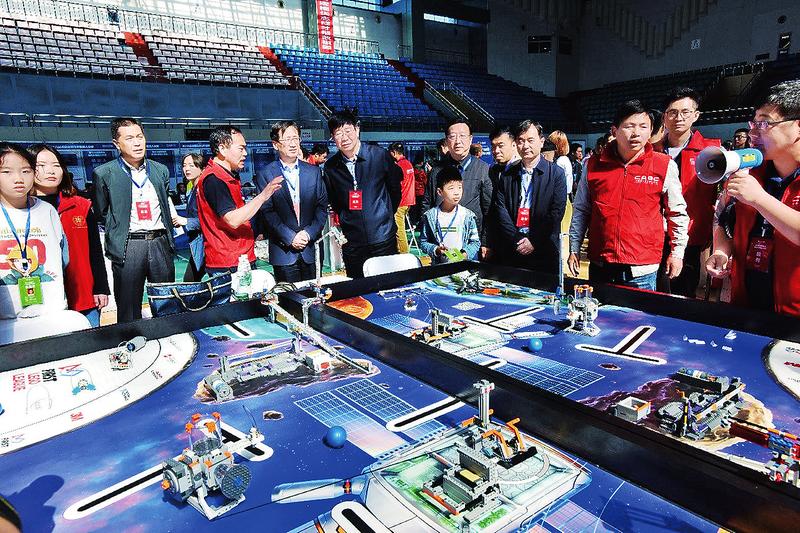 与会领导参观机器人竞赛现场。袁景智 摄 本报讯 5月10日,第十九届陕西省青少年机器人竞赛在陕西师范大学长安校区开赛。活动由省科协、省教育厅、省科技厅、共青团陕西省委、省知识产权局联合主办,陕西师范大学、省青少中心承办。