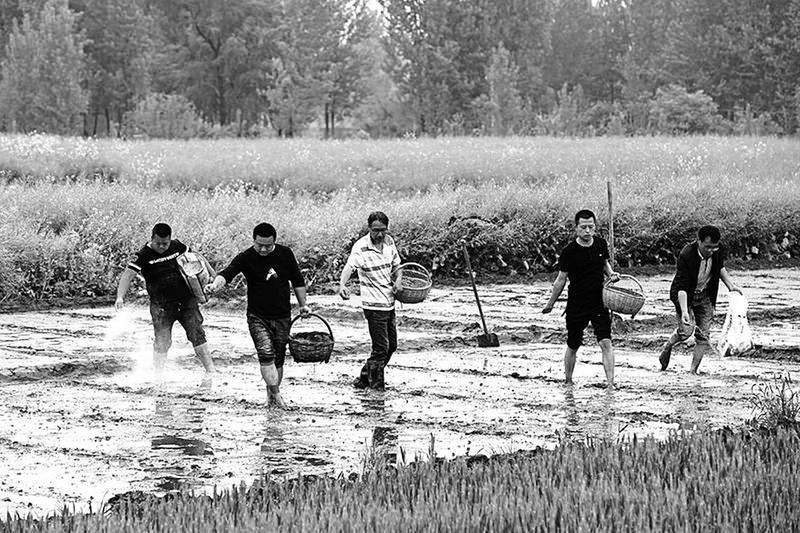 前不久,西安市长安区太乙宫街道关家村关小让、杨波等人决定创业种水稻,传承当地稻米农耕文化,宣传当地优质稻米,恢复稻田的自然风光。图为几位青年在稻田干活。
