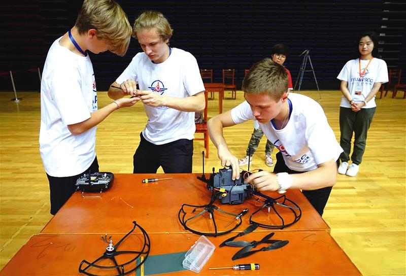 7月21日,由中国航空学会、西北工业大学主办的首届国际青少年无人机科学营及挑战赛在西安开赛,吸引了来自国内十几个省份的百名高中生,以及俄罗斯、匈牙利、马来西亚、泰国等国家的学生参与。图为俄罗斯参赛选手在比赛中组装无人机。