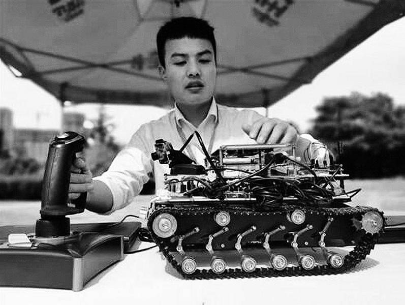 近日,西安邮电大学学生展示自主研发的智能探测机器人。这种机器人可用来探测化工厂区域有毒气体浓度及温度、湿度等。