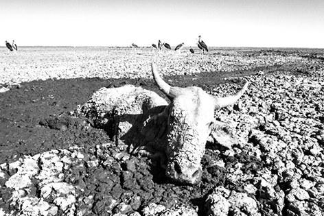 恩加米湖是博茨瓦纳喀拉哈里沙漠北面的内流湖,由于南部非洲旱情,已经好几年没有河水注入,数百头牛马和河马在泥泞中等待死亡,渔民利用干涸湖泊捕获最后剩下的鱼。