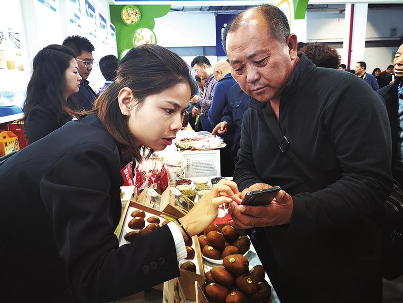10月22日上午,为期五天的第26届中国杨凌农业高新科技成果博览会在杨凌示范区盛大开幕。在科技助力脱贫攻坚展内,武功县南仁健康果业农业科普示范基地的猕猴桃不时吸引着来往的参展群众。图为科普示范基地的工作人员为参展群众介绍猕猴桃的生长环境情况。