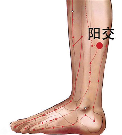取穴:在小腿的外侧,外踝尖上七寸,腓骨后缘。取穴时腘横纹头与外踝尖连线上的中点向下量一横指,腓骨后缘处即是阳交穴的位置。