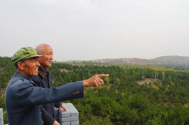 今年10月3日,郑文瀚(后)和老战友闫开玉登高远望那一片片绿林。