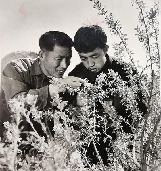 年轻时的郑文翰(左)在实地研究柠条象。 再次回到阔别32年的佳县打火店林场,82岁高龄的郑文翰依然精神矍铄,脚步稳健。看到自己曾经生活、工作过的地方如今已是荒沙变成绿洲,见到曾和自己并肩在沙漠摸爬滚打几十年的“老伙计”闫开玉,他显得格外兴奋,环顾四周,件件往事接连涌上心头,历历在目……