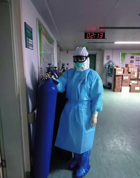 由于病区的供氧不足,大部分病人都需要加用氧气桶(罐装氧气),需要我们自己来换笨重无比的氧气桶。我身高166cm,在女生中不算矮的,但氧气桶差不多和我一样高。刚开始,好几个人一起合作才能换一个氧气桶,几天下来,我们总结经验,掌握技巧后,两个女护士就可以迅速换好,有的甚至一个人就能搞定。虽然掌握了技巧,但一个班要换十几个氧气桶,我们经常是汗流浃背,但看到病人经过氧疗后,血氧饱和度都在上升,所有的辛苦付出都是值得的。