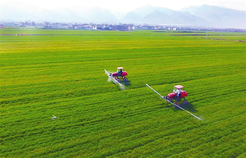 2月19日,在西安市长安区五台街道西甘村的小麦田里,两台自走式喷杆喷雾机伸出10多米的长臂进行喷洒作业。为解决防疫期间的农作物田间管理问题,长安区农业部门组织大型农业机械到地里免费喷洒除草剂、叶面肥,实现了防疫、农耕两不误。