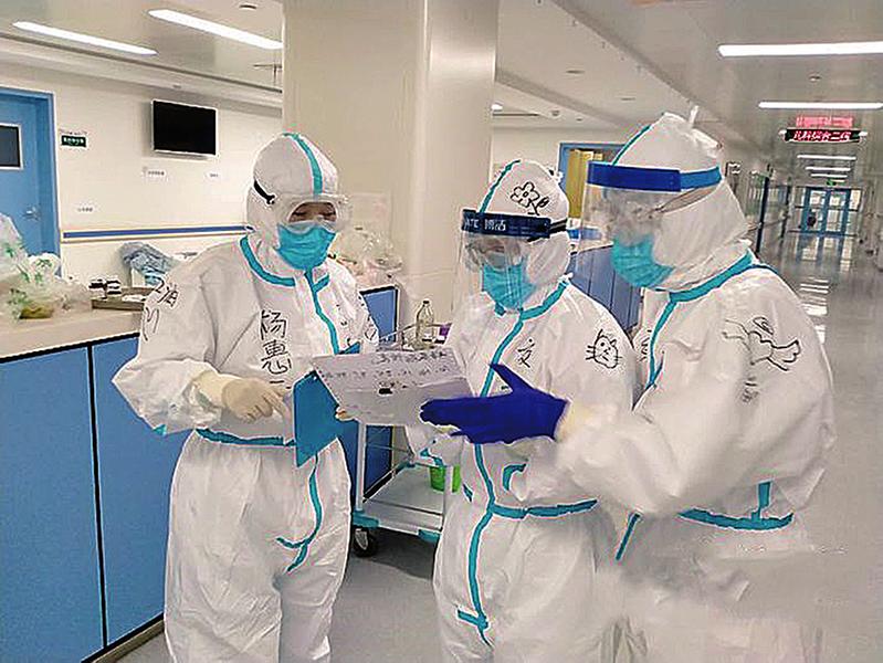 杨惠云(左)和队友讨论工作。 2月8日,西安交通大学第二附属医院抗击新冠肺炎援鄂医疗队出征武汉,这支130人的医疗队有护理人员100名,医院护理部主任杨惠云担任副队长,负责管理护理工作。