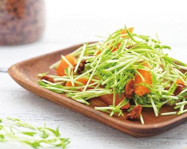 制作方法:参考花生芽的制作方法,不过不需要一直遮光,等三四天后顶出绿芽时,就可以让小芽苗见见阳光了,但注意不要直射,继续经常喷水,小芽苗长到8~10厘米就可以剪下来吃了,不要把根部破坏了,因为剩下的根部还可以再长一两茬。