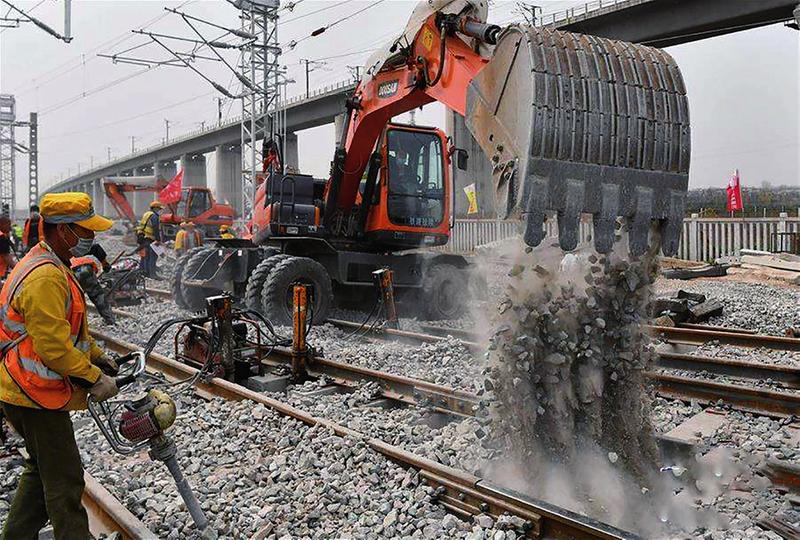 3月22日,银西高铁陕西段茂陵站完成首次转线换装施工,成功将西平增建二线与陇海线接驳,为后续银西高铁建设开通奠定基础。图为工人在茂陵站首次转线换装施工现场作业。