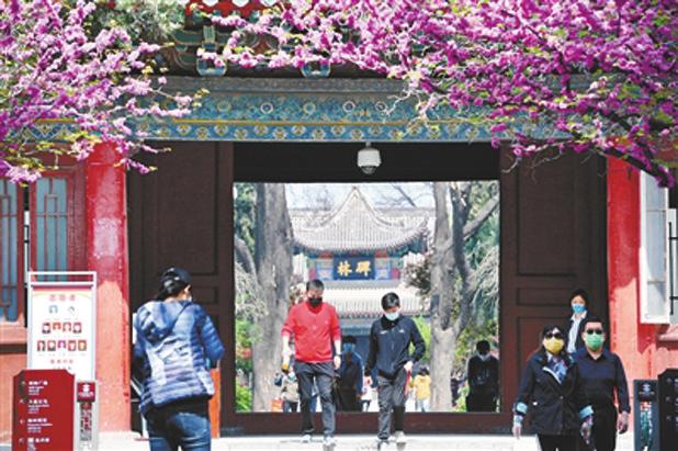 3月25日是西安各大博物馆开放首日。图为西安碑林博物馆内繁花似锦,游客赏花赏碑刻。