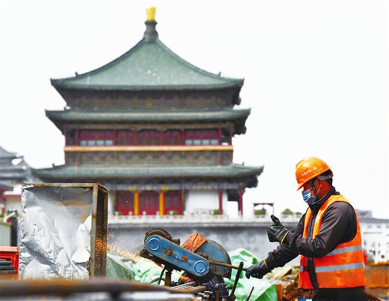 近年来,西安市根据城市发展过程中的实际需要,规划建设了一批立交、地铁、快速路等基础交通设施项目,为城市高质量扩容发展奠定了基础。图为施工人员在西安地铁六号线钟楼站项目施工现场工作。