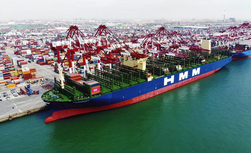 4月26日,载箱量可达2.4万标准箱的世界最大集装箱船“现代商船阿尔赫西拉斯”轮从山东青岛港开启首航,这条船的甲板面积超过2.4万平方米,相当于3.5个标准足球场大小。