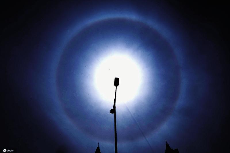 5月8日,哈尔滨主城区上空呈现持续时间近一整天的罕见超大日晕,日晕与各种参照物构成美轮美奂的自然天象景观,令人赞不绝口啧啧称奇。本次日晕环形巨大、色彩绚烂亮丽、持续时间长等特点,适合公众肉眼观赏。