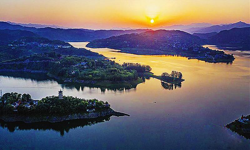 安康市瀛湖水域面积77平方公里,湖中有岛屿近百座,素有“陕西千岛湖”之称,成为独具秦巴汉水自然风光的风景区和人们的休闲之地。图为近日,夕阳映红了瀛湖湖面。