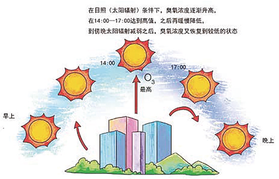 通常情况下,臭氧具有比较明显的日变化规律。臭氧的浓度在清晨时较低,随着氮氧化物和挥发性有机污染物等臭氧前体物的逐渐累积,在日照(太阳辐射)条件下,臭氧浓度逐渐升高,在午后14点到17点达到高值,之后再缓慢降低,到傍晚太阳辐射减弱之后,臭氧浓度又恢复到较低的状态,夜间臭氧受NO滴定作用影响,浓度降到最低。当出现少风、湿度低、光照强的天气时,臭氧浓度会在午后的浓度较高,人们应尽量避免在午后到户外活动。但是在一些清洁地区(森林、海洋等),生成臭氧的前体物浓度较低,因此臭氧的日变化特征并不明显。