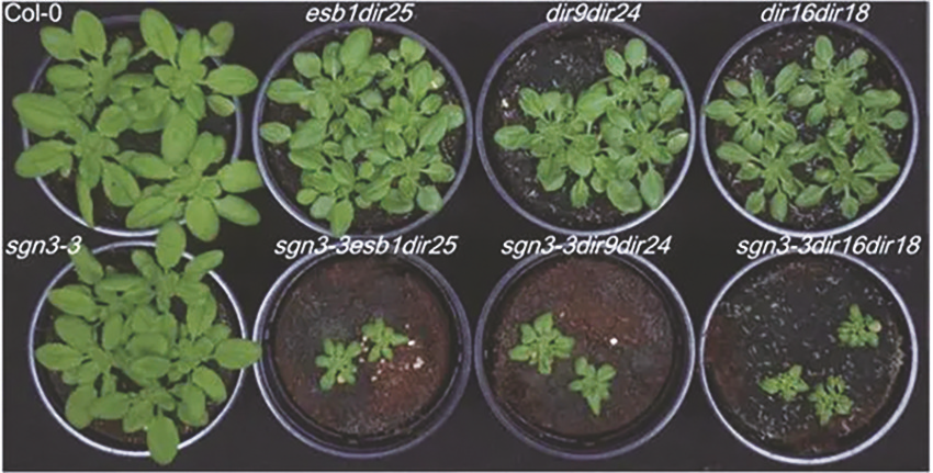 在该研究中,研究人员在拟南芥中鉴定到一组(6个)定位于根内皮层细胞凯氏带的引导蛋白。利用一系列分子遗传学、离子组学和细胞生物学的前沿技术,研究者发现这组蛋白是调控木质素在凯氏带处精准沉积的决定性因子,也是维持凯氏带与细胞质膜紧密连接的必需因子。这类引导蛋白如果突变会直接影响了凯氏带的形成以及凯氏带处的膜-壁紧密连接,进而严重扰乱了植物体内的矿质元素平衡和植物对盐旱逆境的适应性。随后,研究人员还通过分子生物学和生物化学技术,确认这些引导蛋白成员间可以形成异源三聚体,并直接催化木质素单体聚合,形成木质素。