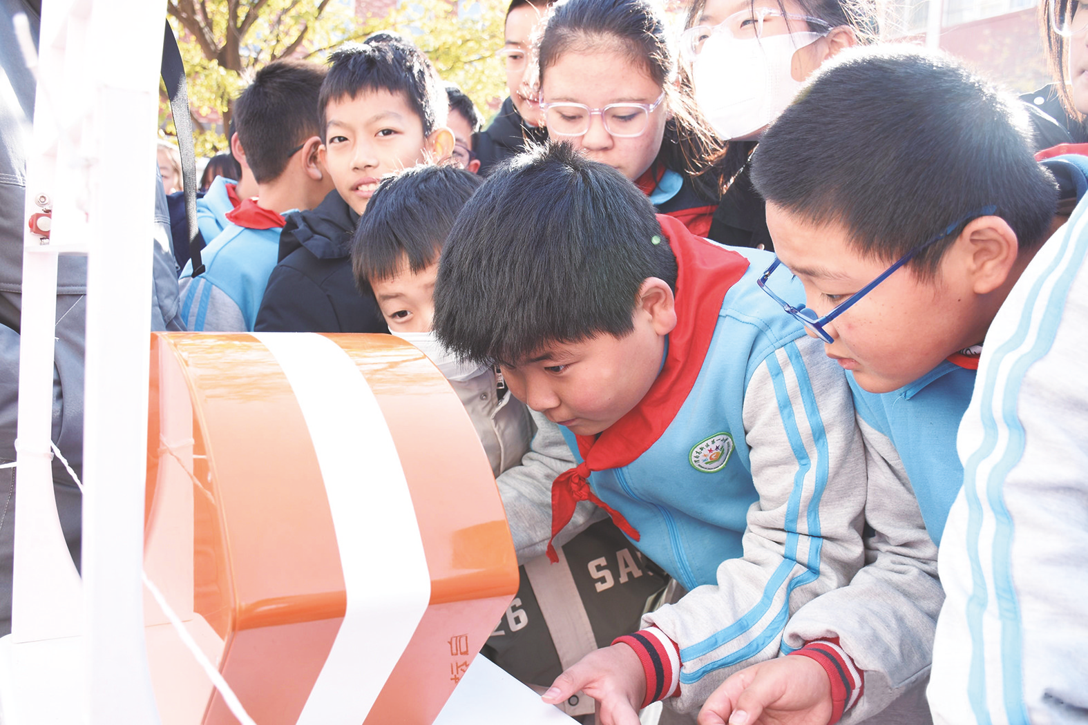 11月28日,渭南市科协、渭南市文联共同组织开展的科普大篷车进校园活动走进渭南高新区第一小学,为该校全体师生带去一场丰富多彩的科学体验课,让学生们在校园里尽情享受“科普盛宴”。图为学生们正在体验科普展品。