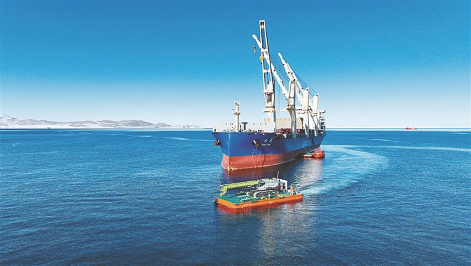 执行中国第40次南极考察任务的“雪龙2”号和“天惠”轮,目前正在罗斯海新考察站开展卸货作业和人员登陆工作。图为12月8日,“天惠”轮在卸载建站物资。