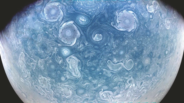 在木星第54次轨道飞行期间,美国宇航局的朱诺号宇宙飞船拍摄了围绕木星北极的风暴的特写镜头。公民科学家布莱恩·斯威夫特(BrianSwift)处理了一张图像,制作了这个高对比度版本,突出了气旋部分。