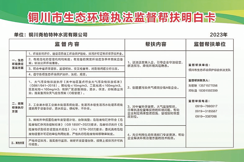 铜川市生态环境执法监督帮扶明白卡旨在强化对企业的监督帮扶,有效助企纾困。明白卡包括监督内容、帮扶措施、帮扶人员、监督举报电话等内容,张贴在企业醒目位置,让企业明白在环保主体责任落实方面应该遵守哪些法律和规定,执行哪些环保政策,在水、气、固危废等产污环节应该执行的排放标准和限值,起到对照提醒、对照检查、对照落实的指导作用。同时列出年度内具体帮扶事项,指定2名执法人员“一对一”指导帮扶。