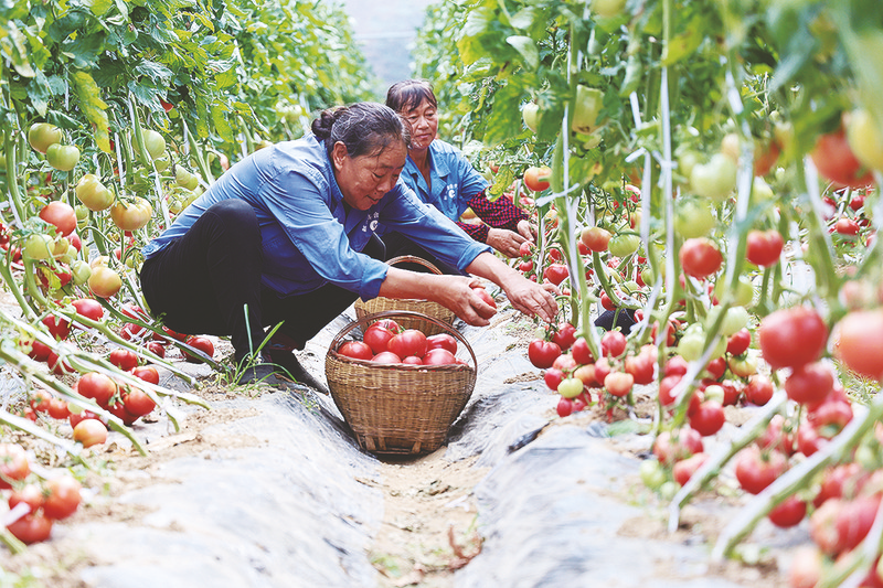 2023年以来,安康市汉滨区以富硒蔬菜产业链项目为抓手,深入开展延链、补链、强链、融链工程,全区蔬菜产量、产值再创历史新高,蔬菜总产量达45.33万吨,总产值11.15亿元,有效推进蔬菜生产持续发展,农民收入不断提高。图为1月26日,在汉滨区一家现代农业园区的蔬菜大棚内,工人正在采摘西红柿。