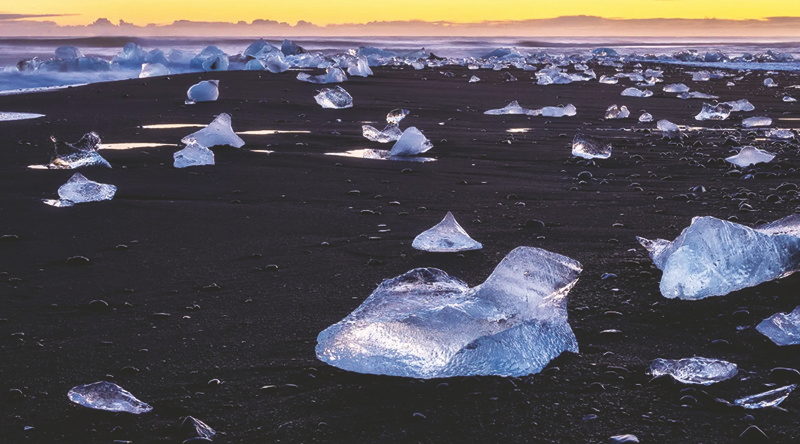 钻石冰沙滩是冰岛最受欢迎的自然地标之一。这个独特的沙滩位于杰古沙龙冰河湖附近,其名字源于从冰川上脱落的冰山碎片,当这些冰山碎片被冲到岸上后,在黑色沙子上就像一颗颗闪闪发光的钻石,而这些黑色沙子则是来自被侵蚀的火山岩。