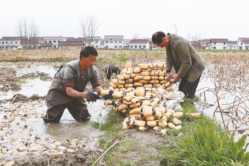 目前,正值春藕采收时节,汉中市南郑区梁山镇荣国村300亩莲藕进入收获季。近年来,荣国村充分依托当地水源丰富的优势,积极引导农户在水塘、沟渠、低洼易涝等闲置地块,大力种植莲藕,助力乡村产业发展。图为3月6日,荣国村群众正在采收莲藕。