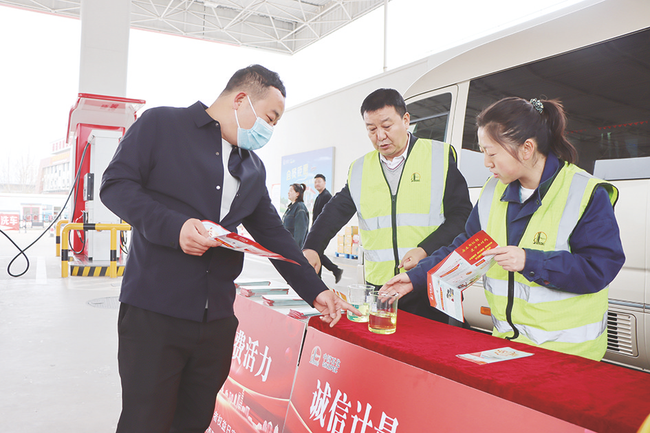 3月15日,中石化商洛分公司开展“成品油市场整顿宣传”活动。图为工作人员现场讲解劣质油品的危害性。