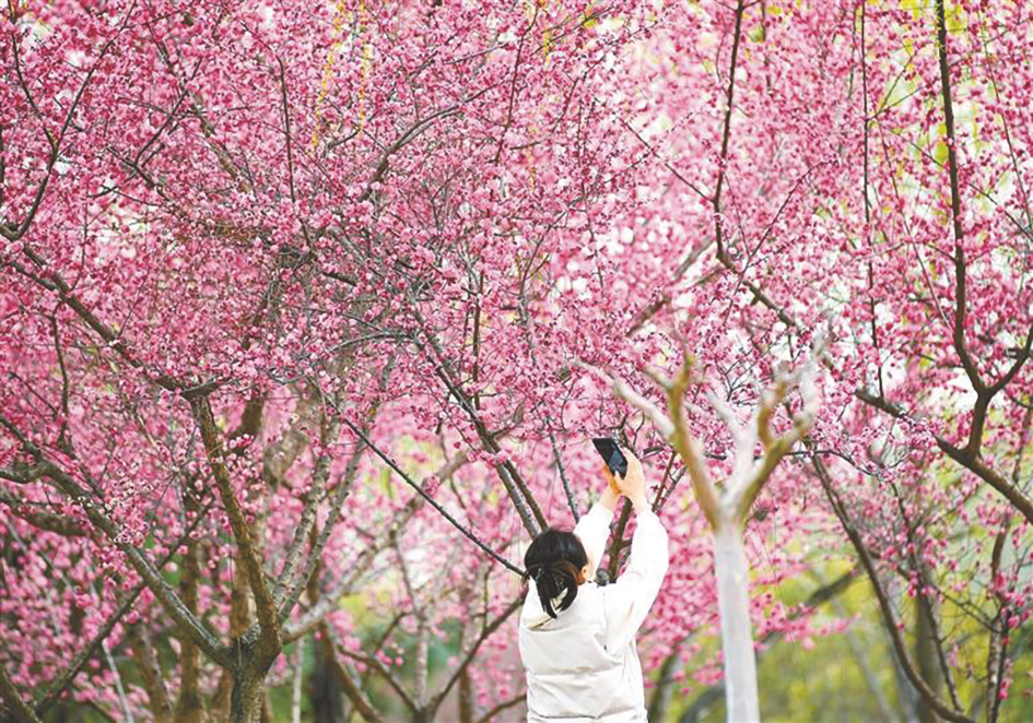 又是一年好时节,当下满眼新绿,万物复苏,公园里、大街上各色花朵次第开放,小鸟们也欢腾雀跃,穿梭在花丛间,奏响春日的交响曲。古城西安春意正浓,踏青赏春正当时。图为市民在西安浐灞国家湿地公园内赏花拍照。