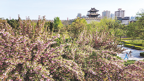 4月9日,西安城墙下春花盛开。
