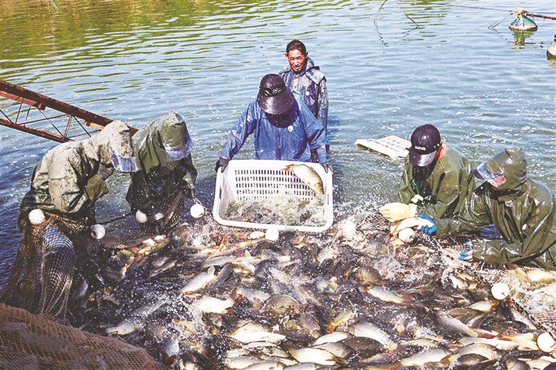 近年来,渭南市大荔县利用盐碱滩地开展水产养殖,全县放养水面3.7万亩,渔业总产值达4.57亿元,昔日的黄河滩涂盐碱地已经变为群众生产致富地。图为6月13日,在大荔县范家镇金裕村的一处渔业养殖场内,工人正在捕捞鱼。