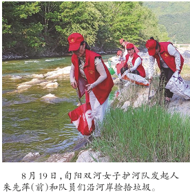 如今,每月1日和15日进行巡河护河,已成为旬阳双河女子护河队雷打不动的工作。沿河岸捡拾垃圾时,队员们时常会唱起朱先萍自编的那句顺口溜:“常常河边转,勤把垃圾捡。确保河水净,清水送京津。”