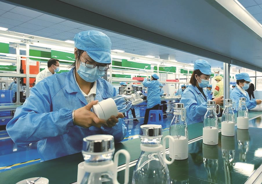 近年来,商洛市山阳县充分发挥民企就业蓄水池作用,不断加大招商引资力度。一批批电子信息企业相继入驻,不仅推动了整个县域经济发展,还让群众实现了就地就业。图为工人在山阳瑞裕电子科技有限公司小家电生产车间工作。