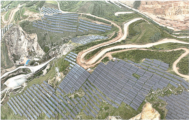 华能泾阳200MW光伏+生态治理发电项目是国内典型的山地光伏项目,也是陕西省年度新能源光伏保障性并网重点项目,项目建设采用新工艺、新材料、新结构技术方案,在对废旧矿区进行地质环境治理后再进行光伏建设。图为华能泾阳200MW光伏+生态治理发电项目。
