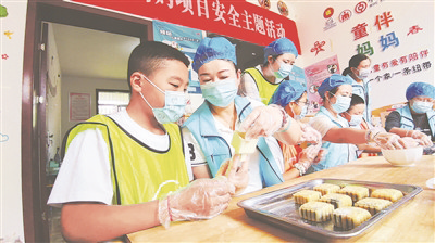9月8日,咸阳市蓝色志愿服务中心的15名志愿者到永寿县马坊镇耿家村,举办“迎中秋佳节 做亲情月饼”活动,为34名留守儿童送去中秋节的惊喜和温暖。图为孩子们在志愿者指导下制作月饼。