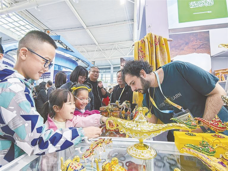 10月28日,在杨凌农高会上合组织国家农业展馆,琳琅满目的商品受到观展群众喜爱。
